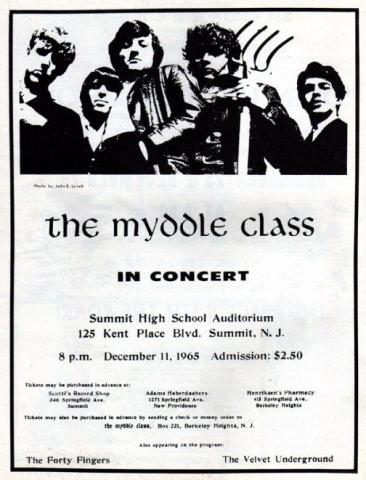 I tutaj muszę napisać o jednej z mojej ulubionej grup - Velvet Underground. Powstała właśnie w Nowym Jorku, ale niewiele osób wie, że jej pierwszy koncert odbył się w grudniu 1965 roku w liceum w Summit, urokliwym, dobrze mi znanym małym mieście w New Jersey. Ponieważ ich pierwszy manager Al Aronovitz mieszkał właśnie w New Jersey, zdecydował, że koncert odbędzie się w audytorium lokalnej szkoły. Velvet Underground byli supportem dla popularnej wówczas grupy z New Jersey "The Myddle Class". Na plakacie zamieszczonym poniżej widać, że nazwa "Velvet Underground" umieszczona została drobniutką czcionką w prawym dolnym rogu. Członkowie grupy dostali za koncert $75.00 (dzisiaj równowartość $596.00). Koncert wzbudził dużo emocji, połowa publiczności była olśniona innowatorskim brzmieniem oraz mrocznym emploi członków zespołu (czarne stroje, długie włosy i czarne okulary), a druga połowa słuchaczy wyszła z sali po niedługim czasie (część nastolatków została zgodnie ze wspomnieniami uczestników wyciągnięta siłą przez rodziców). Trzeba dodać, że wybór utworów granych na koncercie był bardzo kontrowersyjny jak na tamte czasy: "Heroin", "There she goes again" oraz "Venus in furs". Ostatnia piosenka była zainspirowana książką Leopolda von Sacher-Masoch'a, której motywem przewodnim był masochizm.